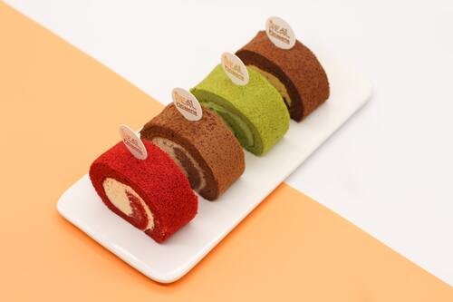 Delicate rolled sponge cakes with cream filling in various flavors